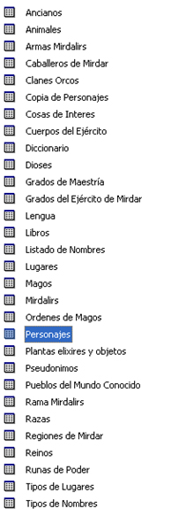 Con cada elemento que se identifique dentro de la historia, se crea una tabla para tener contabilizados todos los objetos, que pueden ser lugares, nombres, razas… Aquí se indican todas las tablas con la información sacada hasta la fecha dentro de la saga Leyendas de los Mirdalirs.