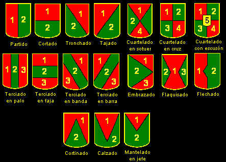 La división de los escudos en cuarteles tiene como objetivo poder representar en un mismo conjunto las distintas armas de varios linajes, territorios… Puede ocurrir que las armas de un linaje o territorio no sean sencillas o primitivas y a su vez estén divididas en cuarteles. El tratamiento de éstas que podríamos llamar subdivisiones, es el mismo que el de los cuarteles principales. Lo mismo ocurre con cada uno de los cuarteles de la descripción interior, se efectúa como si fuese un escudo independiente.