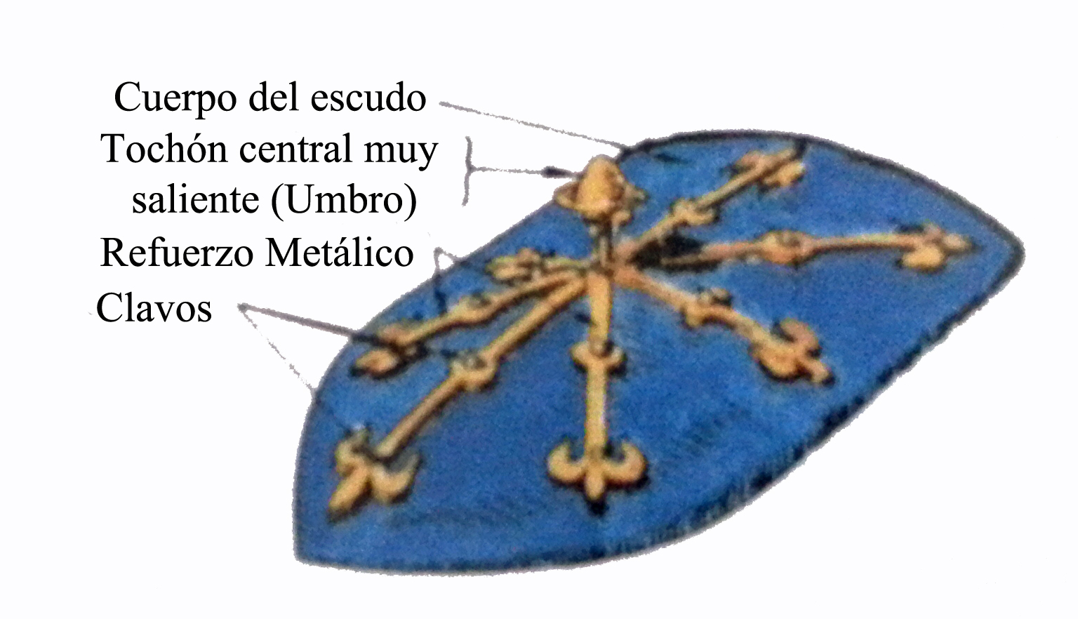 A consecuencia de los golpes recibidos en las luchas y combates, este tipo de escudos (los de suela de madera) se deterioraban, y para reforzarlos se ponían trozos de metal, donde se halla el origen de las principales piezas, como son el palo, la faja, la banda…