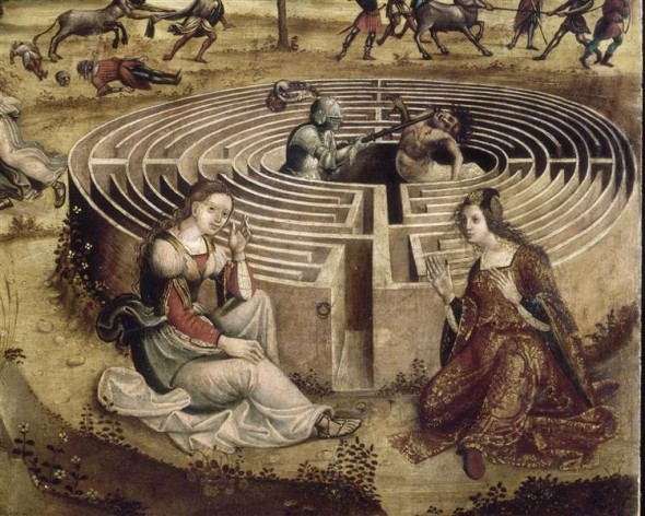 Una vez nacido el Minotauro, Minos supo el horrendo adulterio de su mujer y conoció el terrible fruto de su unión. Avergonzado y temeroso, decidió ocultar al monstruo. Minos ordenó a Dédalo construir un palacio donde apresar al Minotauro. Para evitar que el monstruo pudiera huir, Dédalo ingenió un palacio laberíntico. En él, los pasillos y las salas se enrevesaban de manera que fuera imposible la huida.![]()