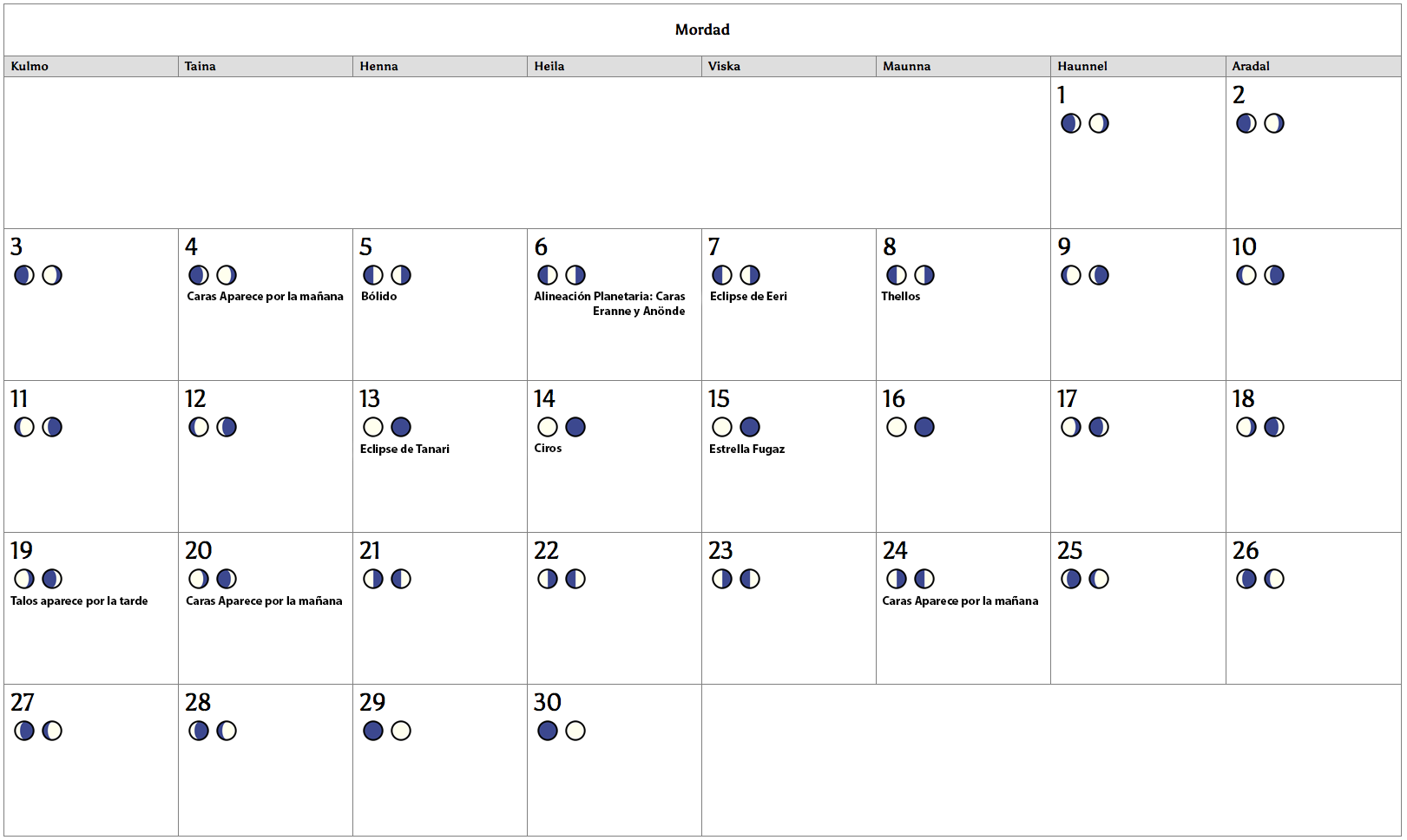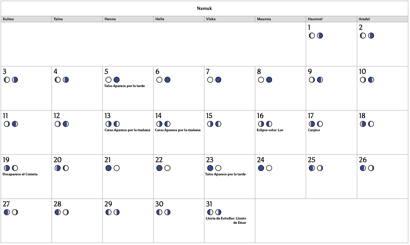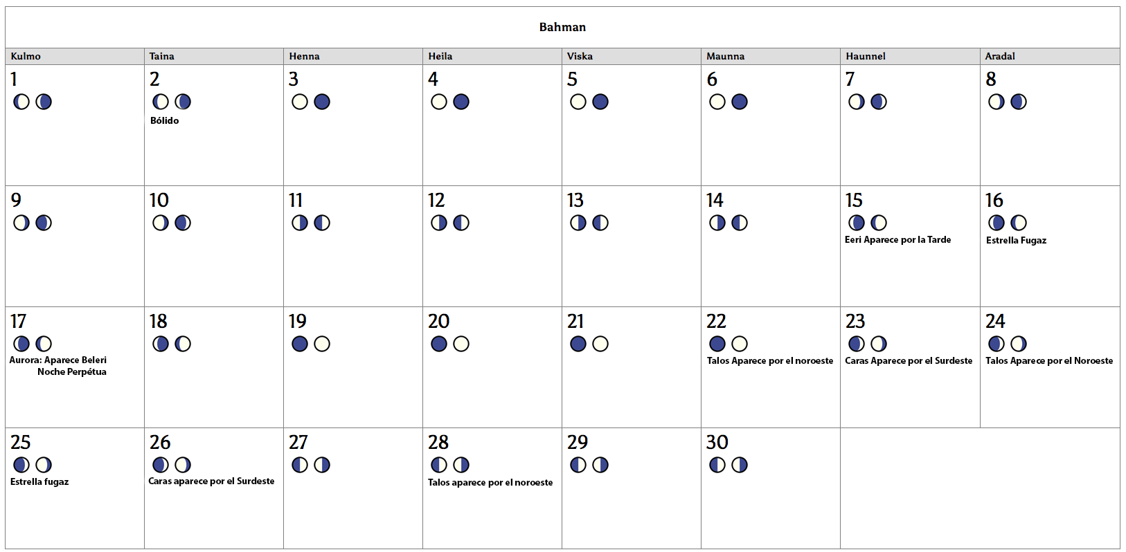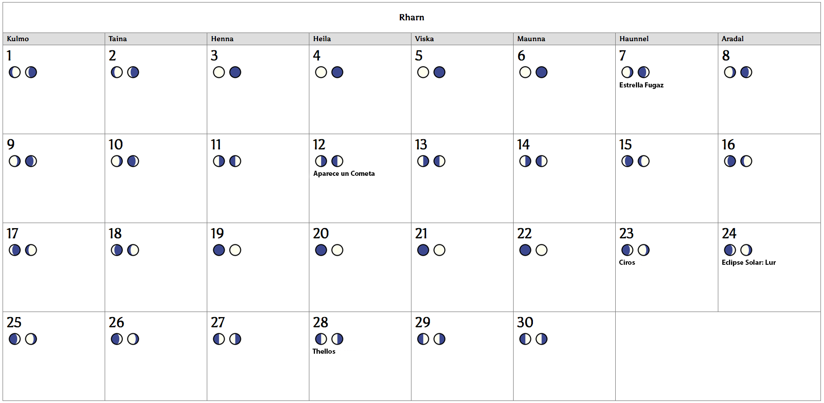 Se muestra un ejemplo de un año de 445 días que transcurren en el Mundo Conocido (Año 1190 de la Cuarta Era):