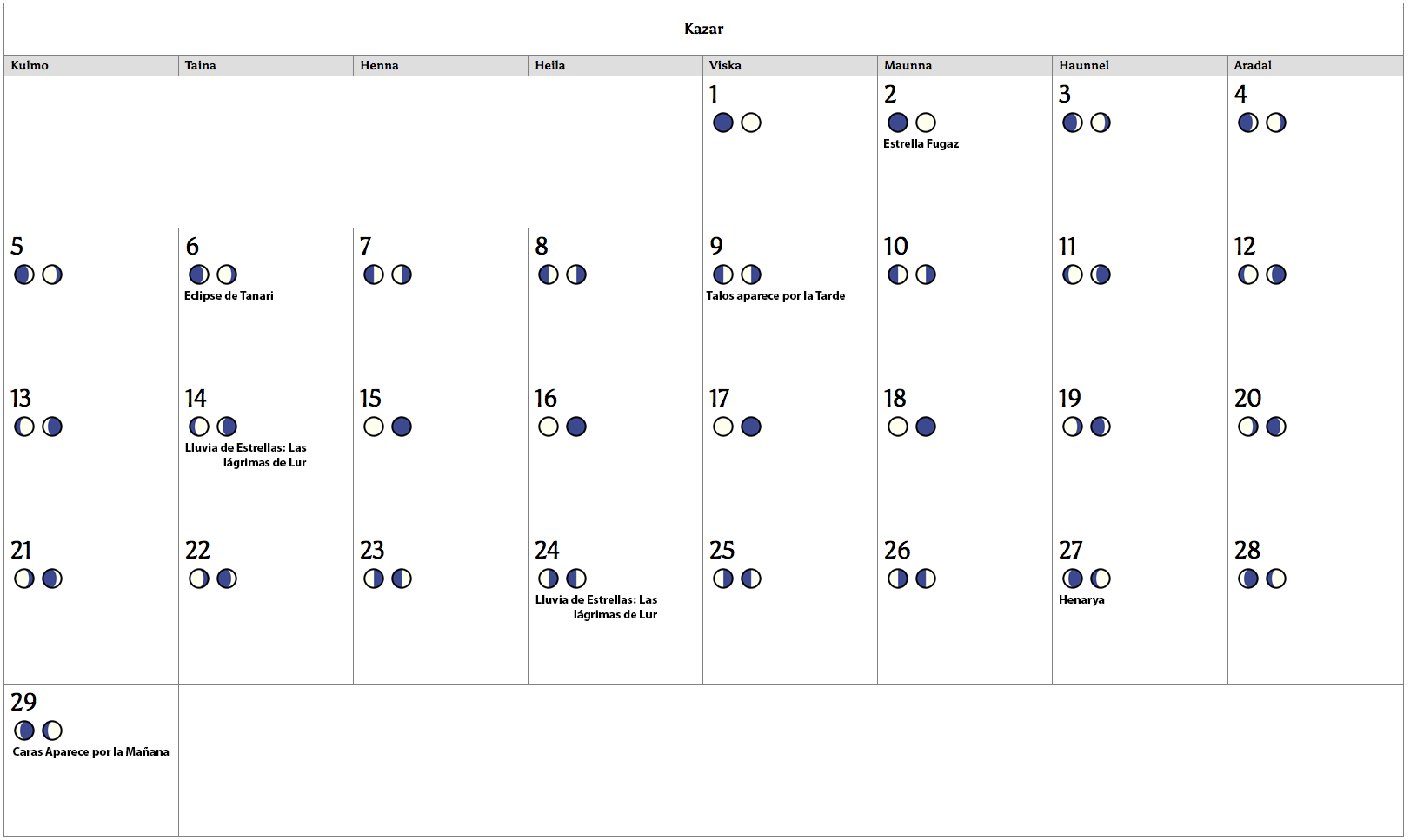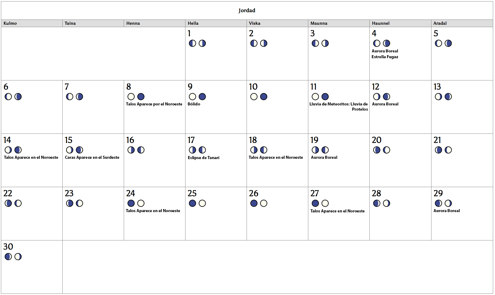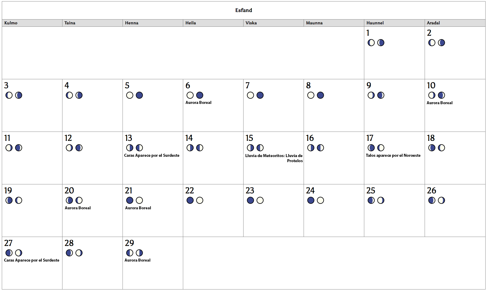 Se muestra un ejemplo de un año de 445 días que transcurren en el Mundo Conocido (Año 1190 de la Cuarta Era):