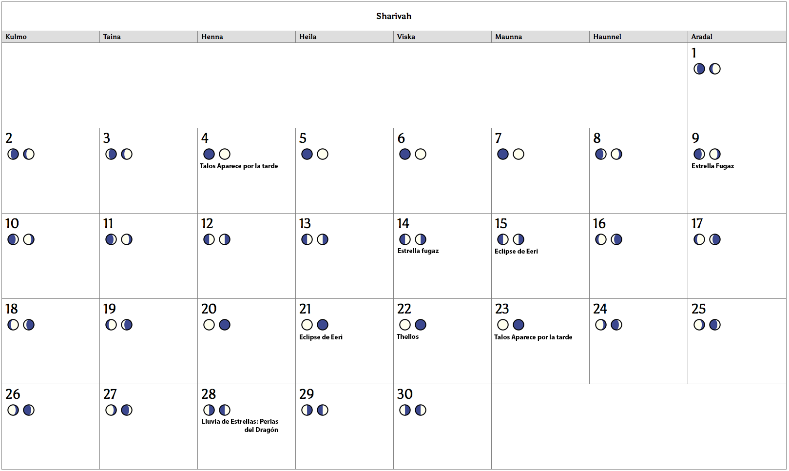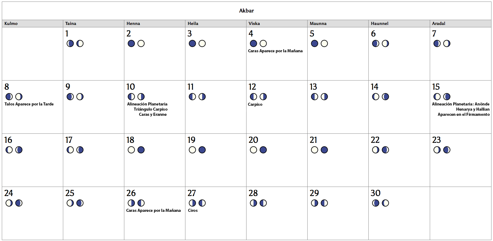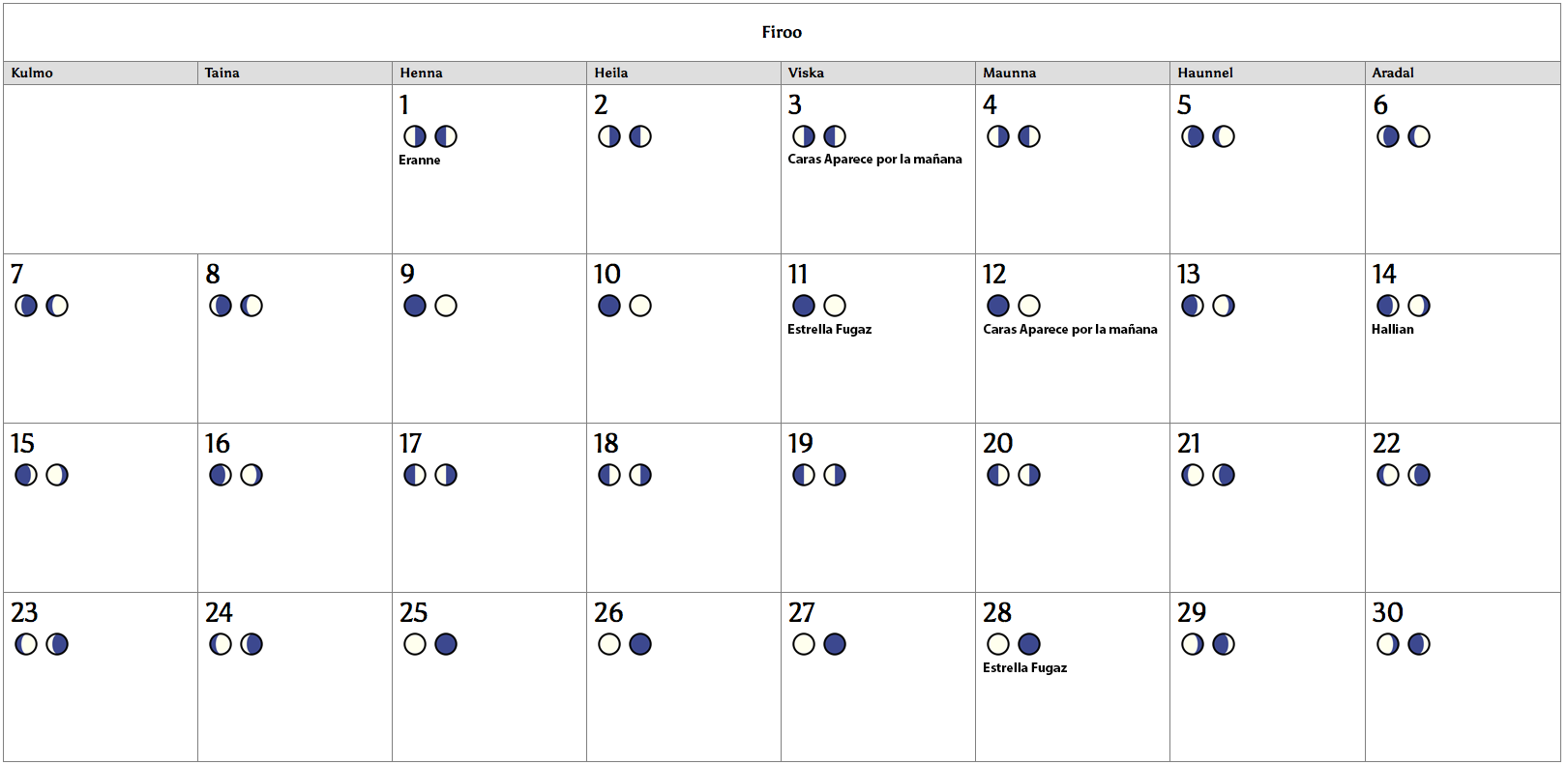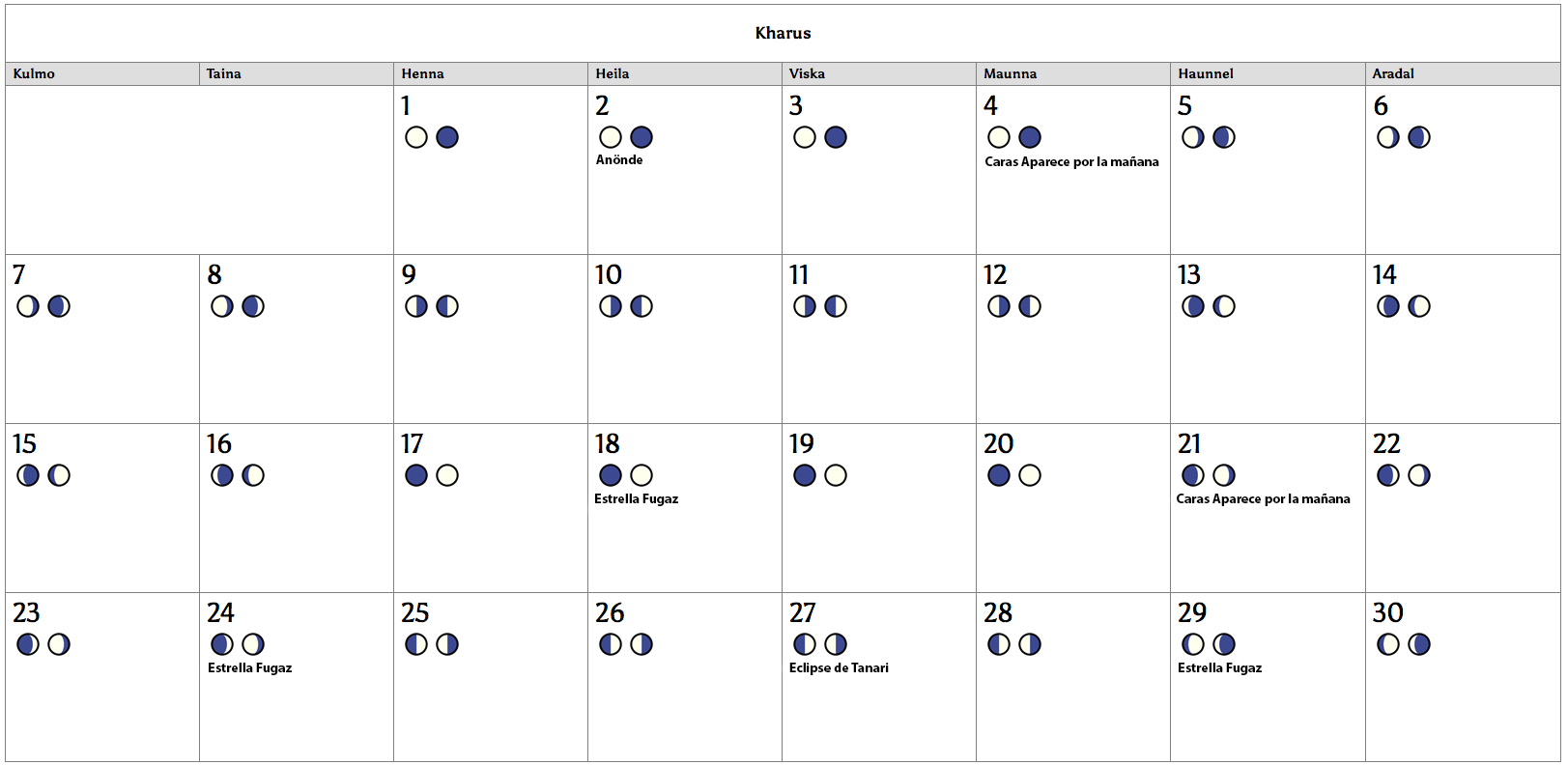 Se muestra un ejemplo de un año de 445 días que transcurren en el Mundo Conocido (Año 1190 de la Cuarta Era):