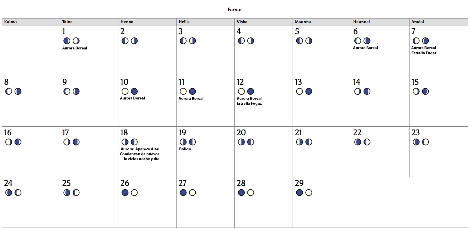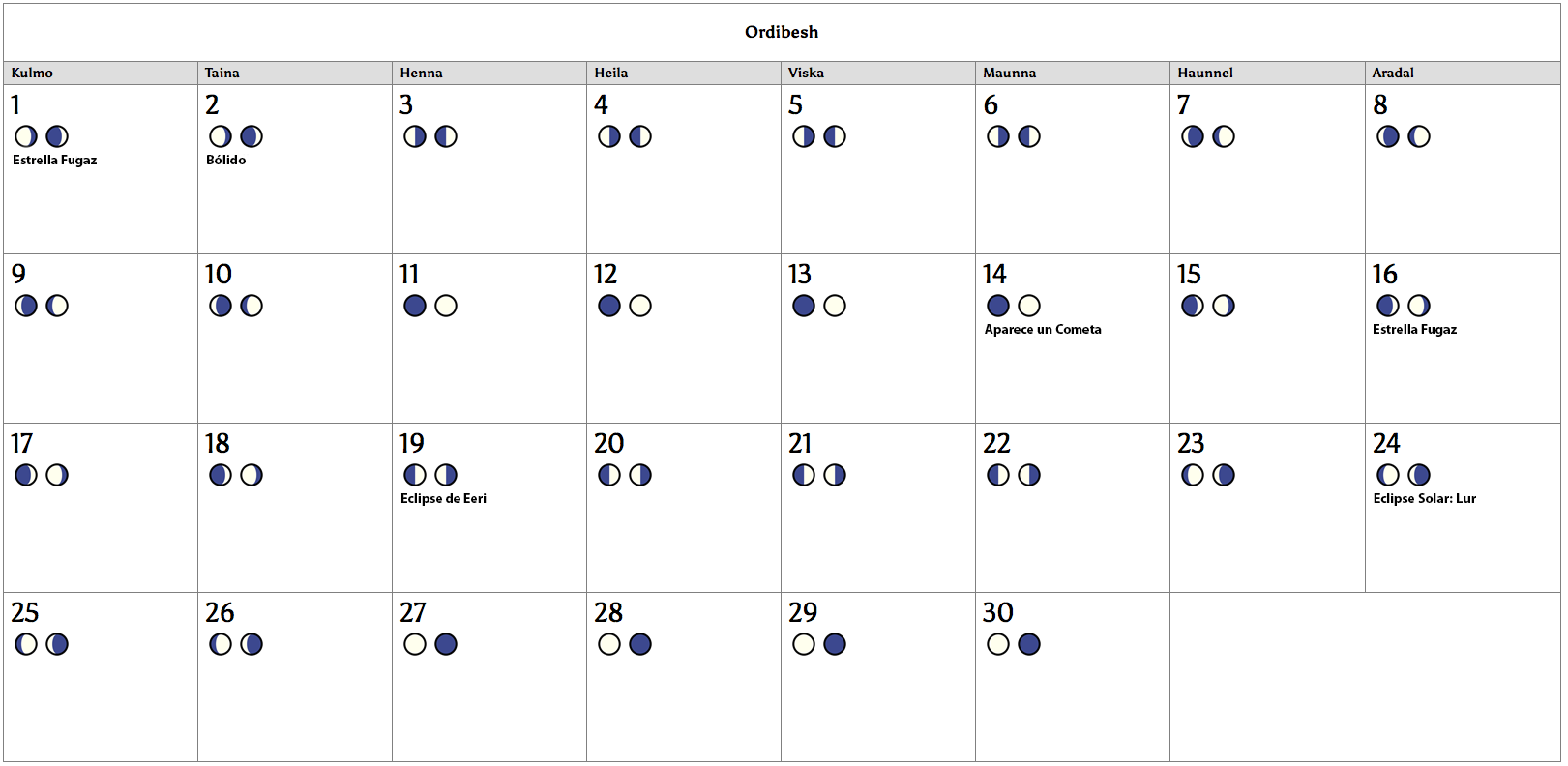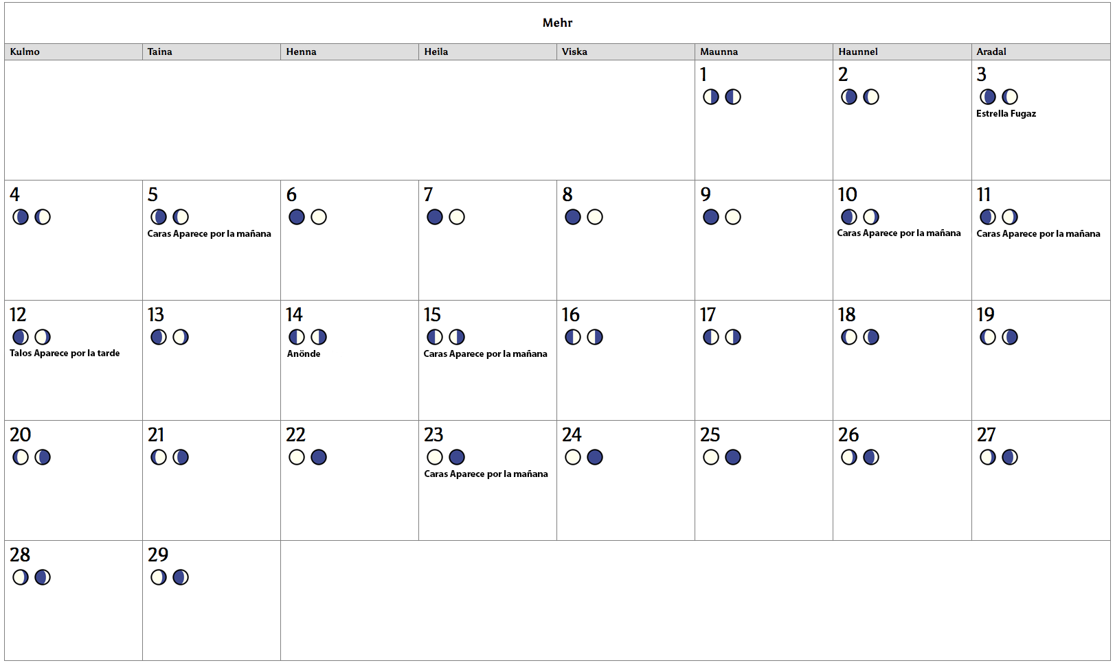 El calendario es el utilizado por los Mirdalirs, y se divide en un año de 445 días y en 15 meses de 29 o 30 días.