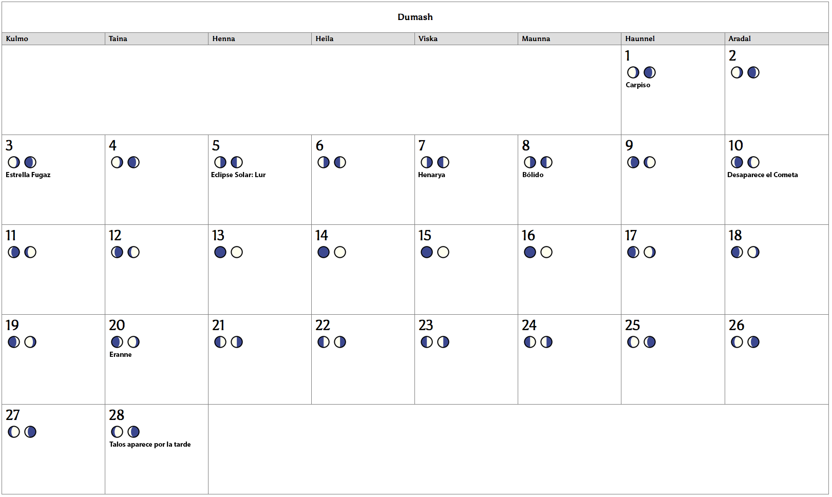 Es un calendario lunar marcado por los dos satélites que lo forman. Las dos lunas cumplen ciclos de 32 días y un cambio alterno de fase (De Luna Llena a Luna Nueva o viceversa, según la luna) cada 16 días, de tal forma que el año se completa con 111 cambios de fase lunares hasta un total de 8 diferentes. Se añade un día más ya que el año el año tiene 445 días.